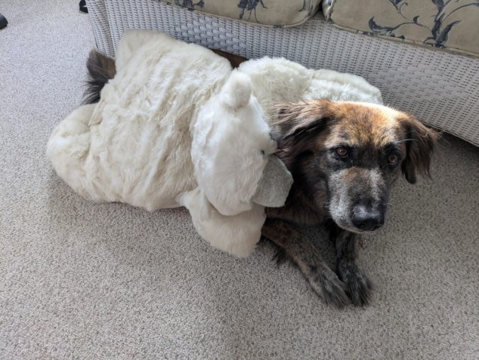 Mark’s childhood bear cuddles with Maya