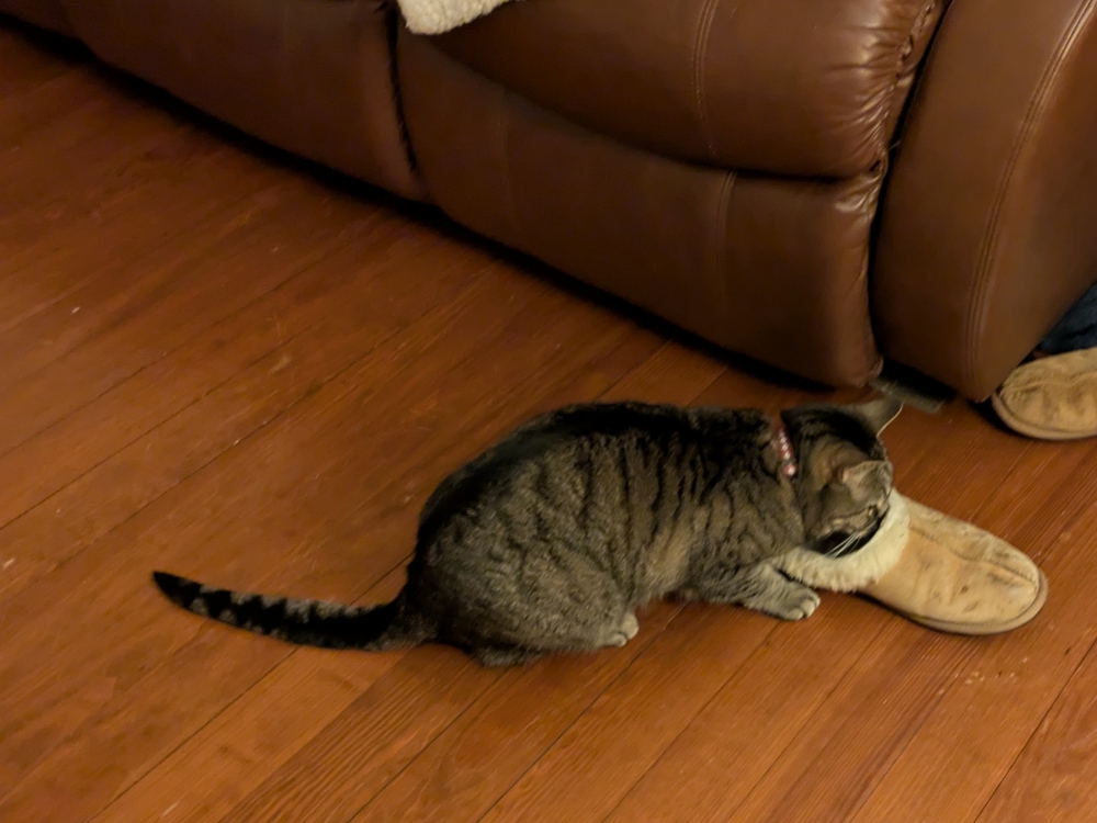 One of the cats playing with my indoor slipper in the middle of the night!