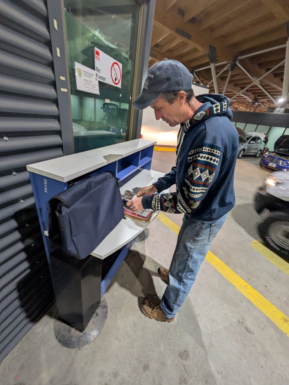 Filling out paperwork in the car arrival section of the building