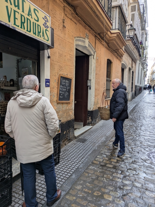 Produce vendor sending the full basket back up to the elderly woman.