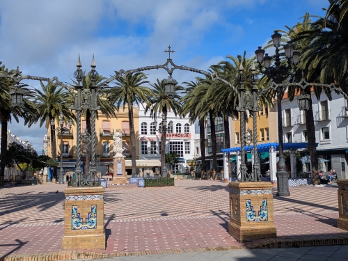 The square looks tropical under the blue sky.