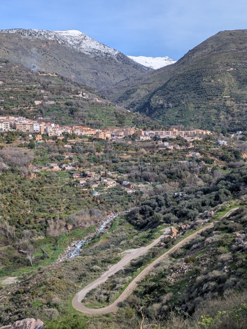 Lanjeron in the valley with a snowy peak behind it