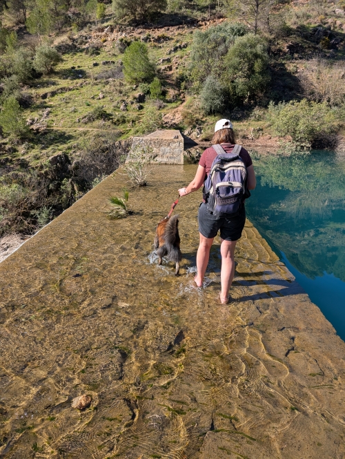 Mark wanted to turn back the way we came after discovering the flowing water from a higher to a much lower level, but I’m all about loop hikes, so I checked the connecting concrete patch to see if it was safe. Then, I took Maya and the bag and Mark, slowly, followed. Well done!