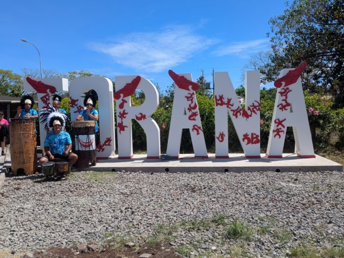 A welcome sign and local drummers