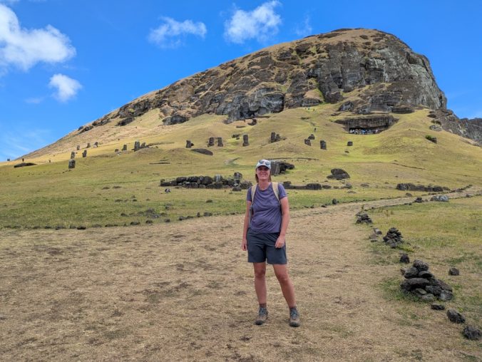 The hill behind me is sprinkled with hundreds of moai