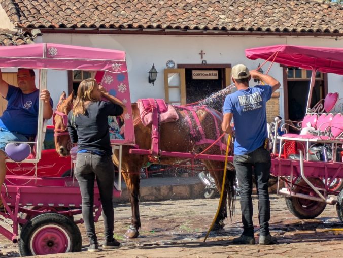 Horses being cooled down and hosed off by the main square