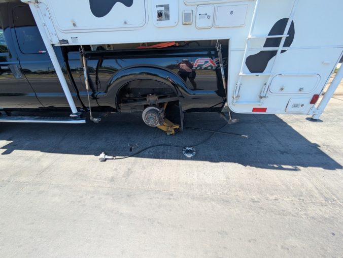 Hopefully, the jack is strong enough to keep our heavy camper in the air!
