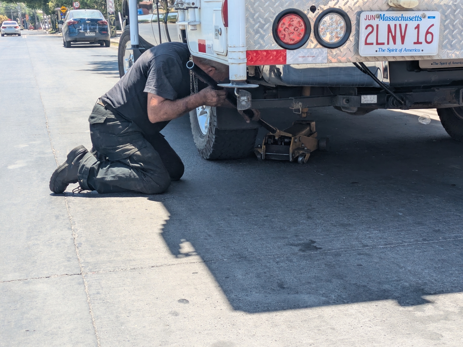 Finally finding a place that can install our new tire, which we had to carry around