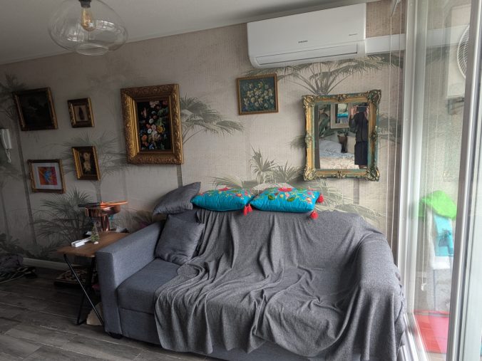 A big sofa with one of our blankets, so Maya could rest here as well, before her neck pain