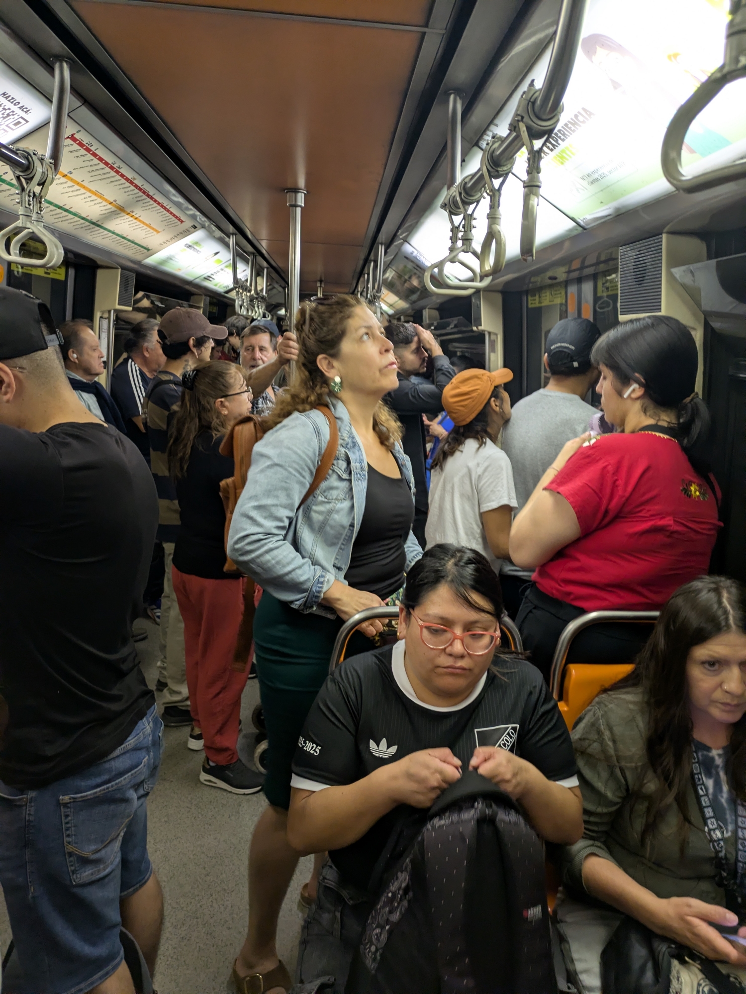 The crowded, unairconditioned metro in Santiago