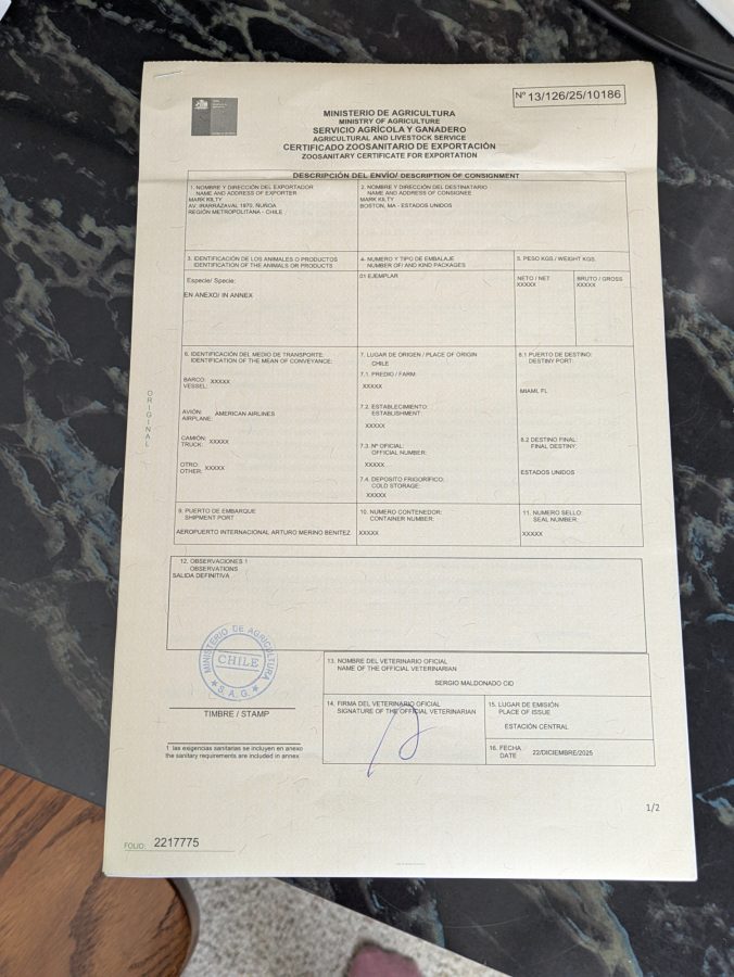 And this is the fancy and pricey international health permit from SAG in Chile to allow us to officially “export” our dog from the country – namely, flying with her to the US.