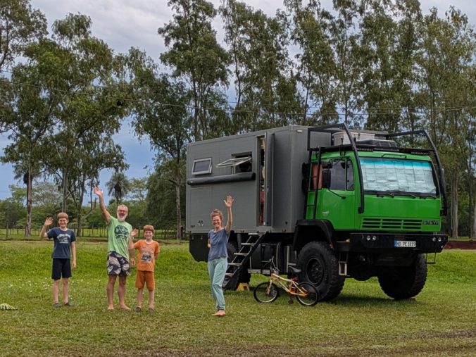 Waving goodbye to our new friends Alex and Jochen and their two teenagers Emile and Paul