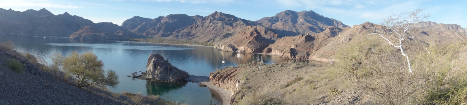 In the beginning of February, Mark, Maya, and I spent ten days on a pebble beach near Agua Verde in Baja California, Mexico. During that time, we visited this small village with our friends Duwan and Greg, in their car. Waiting for a fish taco lunch at the town’s waterfront, we spotted a protected bay with anchored boats and a sandy beach through binoculars. We decided to stop there on the drive home. Within five minutes of setting foot on that white beach and gazing at the surrounding rock formations, Mark and I concluded: “Let’s stop here for a week on our drive back north.”